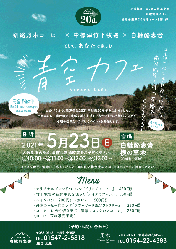 第1弾は、釧路・舟木コーヒー×中標津・竹下牧場×白糠・酪恵舎、そして参加してくれる、あなたと楽しむ「青空カフェ」を開催。完全予約制の密にならない環境で開催しますので、春の青空の下、くつろぎにいらしてください。