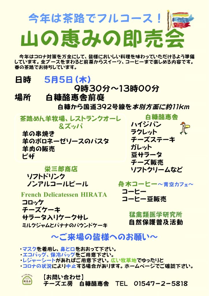 昨年は物販のみでしたが、今年はコロナ対策を万全にして皆様に楽しいひとときを過ごしていただけるよう準備を進めています。奥の広い牧草地を開放します。レジャーシートなどをお持ちになり、好きな場所でゆったりとお過ごし下さい。又品物を入れるエコバッグや保冷バッグなどもご用意下さい。桜が咲きそうです!春の茶路で皆様にお会いできるのを楽しみにしています。
